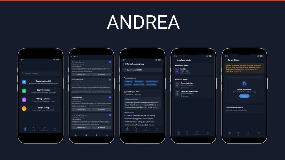 Hvad er projekt Andrea? Et forsøg på at lave den bedste AI medarbejderløsning til kommunale medarbejdere. Appen skal være én samlet indgang til alle GenAI løsninger i kommunen. AI skal gøre din arbejdsdag lettere, ikke mere uoverskuelig. Derfor skal AI være let tilgængeligt og i øjenhøjde.